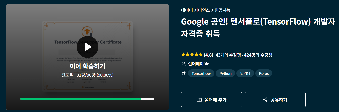 2) 나는 텐서플로우를 잘 모르거나 기출 문제로 공부하고 싶다 → 인프런/런어데이 강의 추천