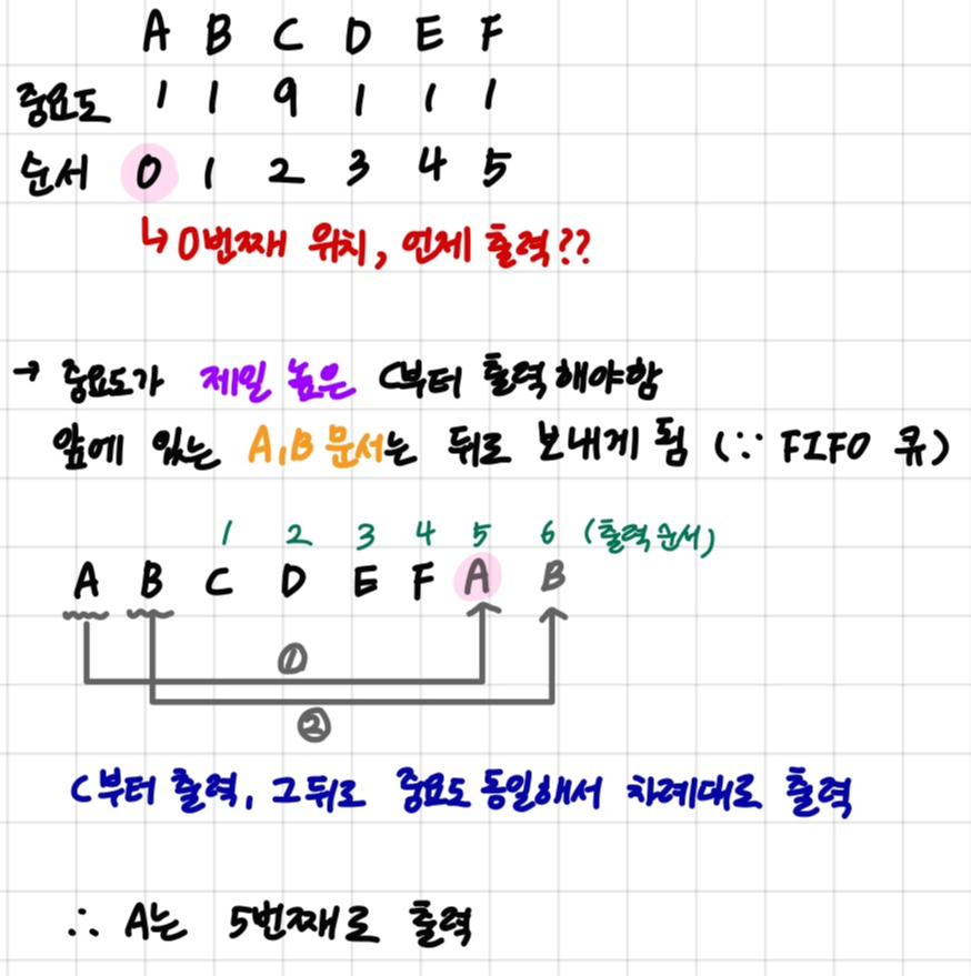 queue.pop(0) # 구해야하는 문서가 아니면 출력만 하고 다음으로 넘어감