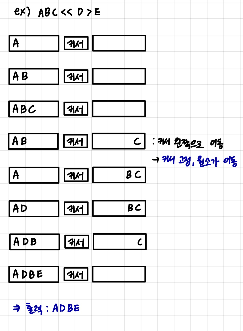 ① 스택 2개를 만들어 스택 사이 중간지점을 커서로 간주