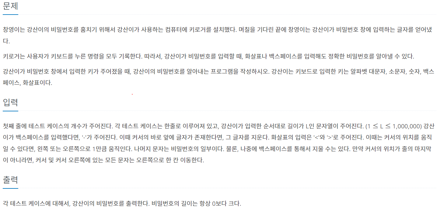 첫째 줄에 테스트 케이스의 개수가 주어진다. 각 테스트 케이스는 한줄로 이루어져 있고, 강산이가 입력한 순서대로 길이가 L인 문자열이 주어진다. (1 ≤ L ≤ 1,000,000) 강산이가 백스페이스를 입