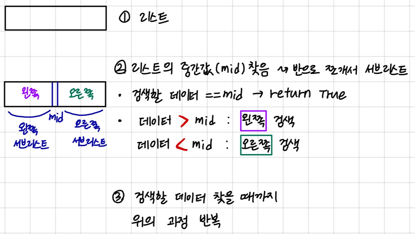 - 검색할 숫자 > 중간값 : 뒷 부분의 서브 리스트에서 검색할 숫자를 찾음