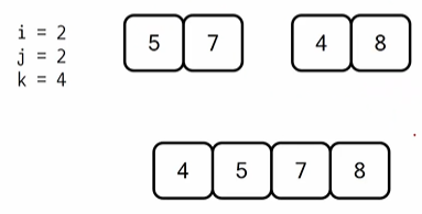 while i < len(left) and j <len(right): # i와 j가 가리키는 값 비교 -> 작은 값을 k에 넣기