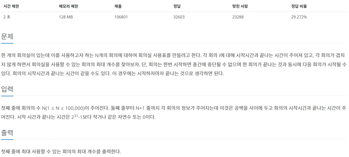 ⇒ 주어진 시작시간과 끝나는 시간들을 이용해서 가장 많은 회의의 수를 알기 위해서는 빨리 끝나는 회의 순서대로 정렬을 해야 한다. 빨리 끝날수록 뒤에서 고려해볼 회의가 많기 때문이다.
